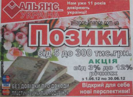 Зазначені суб’єкти господарювання у засобах масової інформації, в рекламній інформації на транспорті, а також через листівки поширюють привабливу рекламу – позики, гроші, кредит надаються на надзвичайно привабливих умовах тощо.